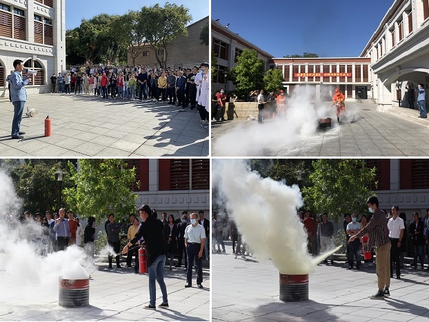 随后,学校保卫处防火与交通安全管理科副科长孙俊逸为在场师生详细讲解了手持灭火器的使用知识,强调了灭火过程中的注意事项,并现场演示了灭火器和水带的正确使用方法。之后,在场师生纷纷加入演习队伍,实际学习操作使用灭火器。