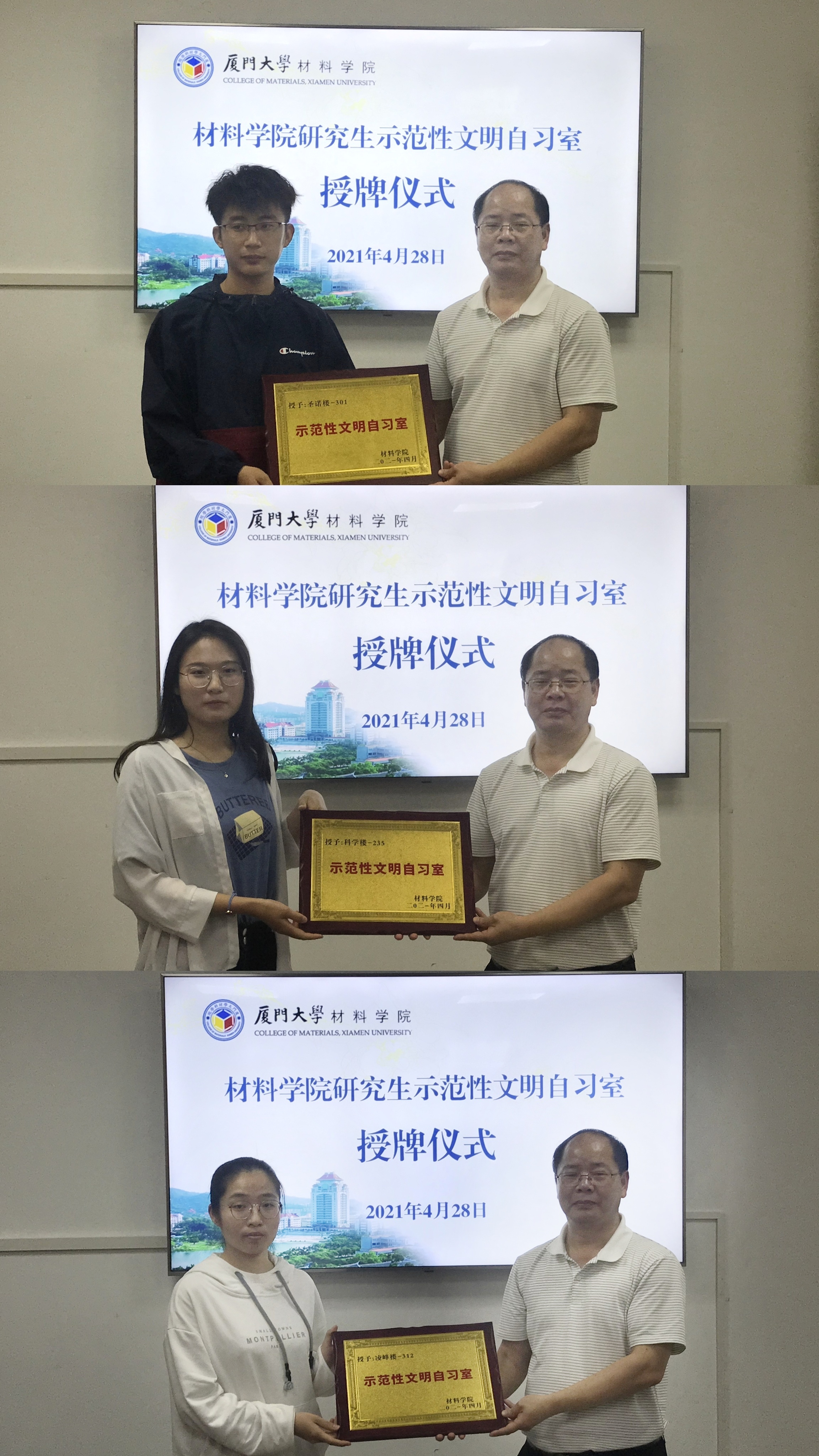研究生中心党支部成员通过实地走访、调研,最终由学院学生工作组确定圣诺楼301室、凌峰楼312室、科学楼235室作为“研究生示范性文明自习室”。刘立荣书记分别对三个自习室进行授牌,并做了讲话。他指出,“示范性文明自习室”的牌匾拿在手中沉甸甸的,就像是落在大家身上的担子一样,希望能通过这三个自习室,以点带面,为全院研究生自习室的文明建设发挥领头雁作用,希望其他学生自习室也要对标争先,共同营造规范、有序的自习室。他还勉励学生党员要充分发挥先锋示范作用,不断提升学院研究生学习、科研环境。